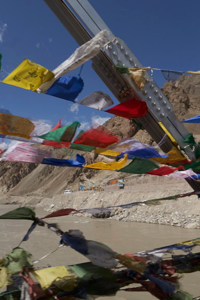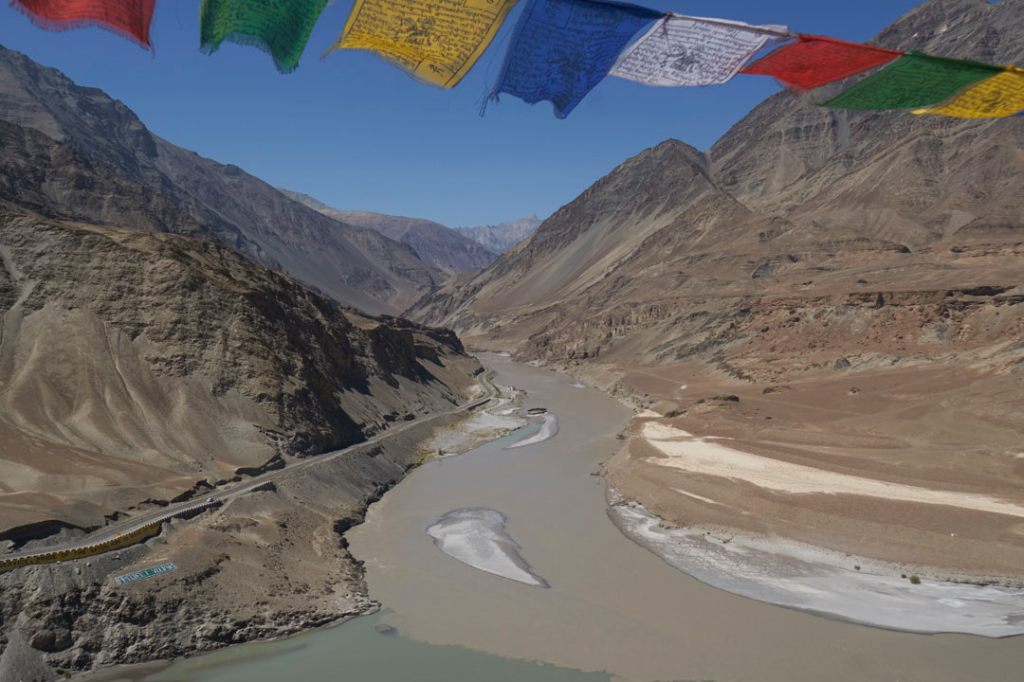 Vor 3 Tagen sind wir in Leh abgereist, und fahren jetzt auf der NH1 in Richtung Westen. Ziel ist schließlich Srinagar, die Hauptstadt von Kashmir. In 4 Etappen durchqueren wir Ladakh und der erste Zwischenstopp ist in Alchi geplant. Dem Verlauf des Indus folgend durchquert der Leh-Srinagar-Highway die Berge Ladakhs. Diese leuchten in vielen verschiedenen Farben und auf der Fahrt über die Serpentinen staunen wir ständig über die Schönheit dieses Gebirges. Der Fahrer stopt ca. 30 km hinter Leh an einem Viewpoint. Wir schauen auf nichts Geringeres als die Mündung des Zanskar-Flusses in den Indus.