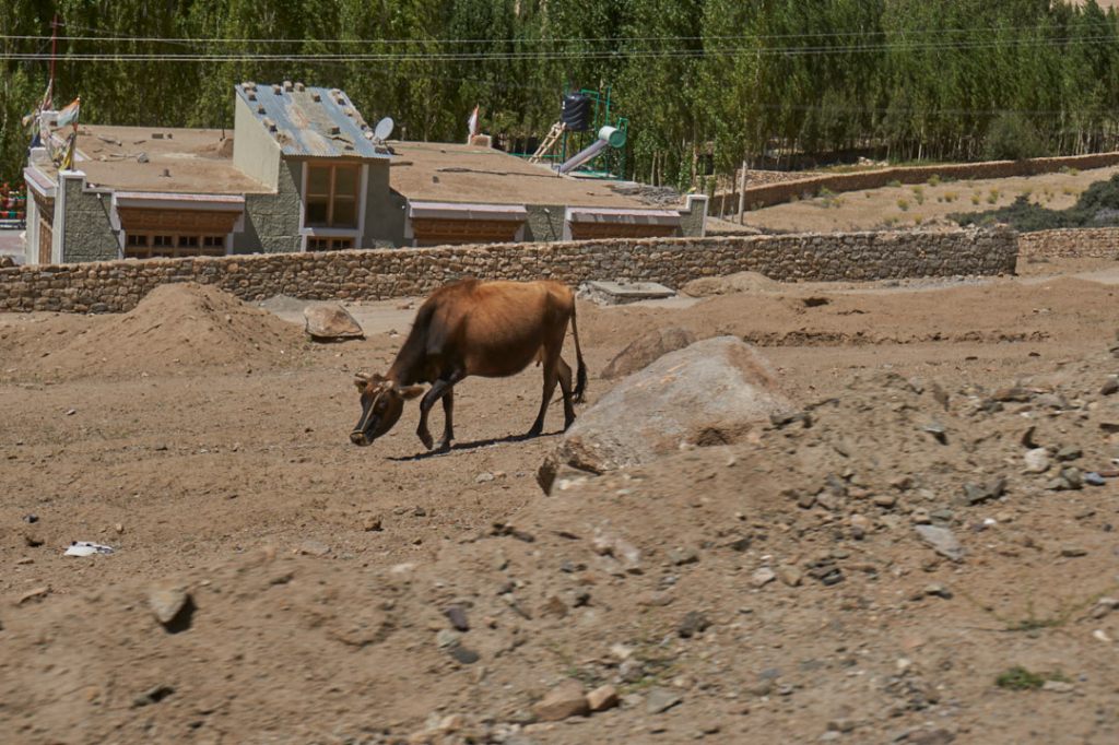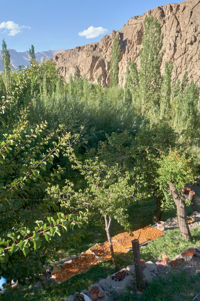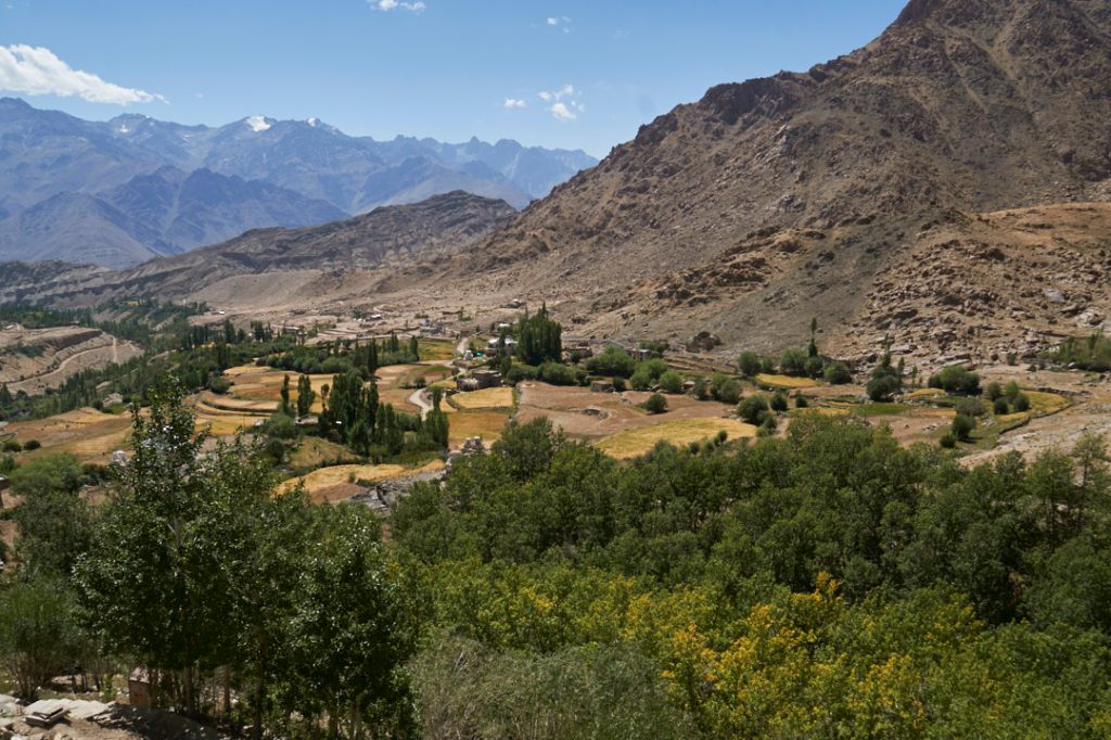 Wenige Minuten später erreichen wir Alchi, unsere Übernachtung für heute. Alchi liegt ganz unten im Tal, gleich in der unmittelbaren Nähe zum Indus. Wir sind früh da und stromern noch gemächlich durch die engen Gässchen des Ortes. Es ist herrlich ruhig und meist auch schattig unter den Aprikosen- und Walnuss-Bäumen. Es ist nach dem lauten Leh eine Wohltat dieses paradiesische Dörfchen zu erleben.