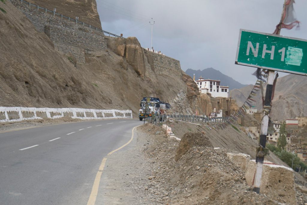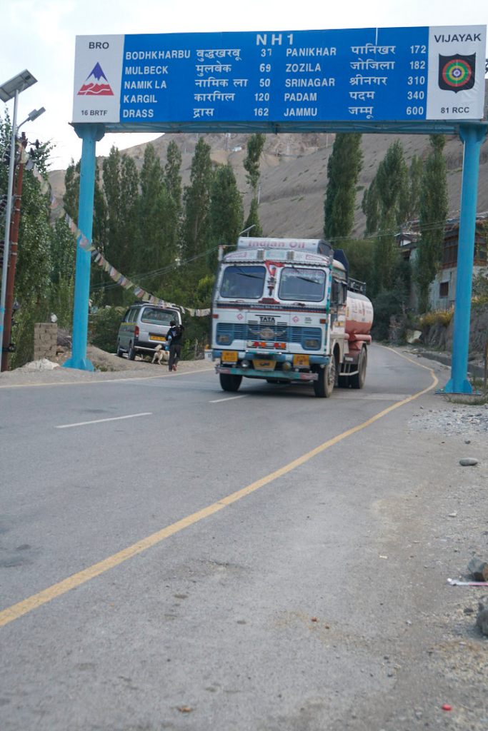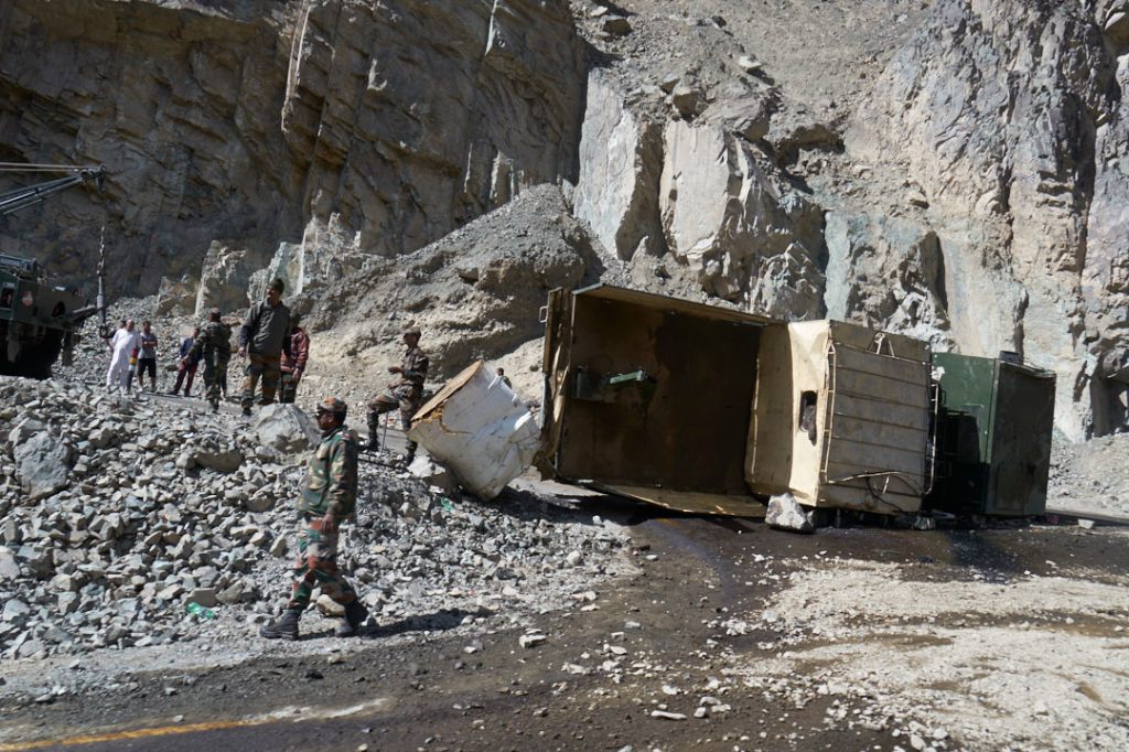 Bei der Fahrt auf dem Highway fallen die vielen Militär-LKW auf. Ladakh hat eine sehr starke Präsenz des indischen Militärs und immer wieder fahren wir an Kasernen vorbei. Hier herrscht dann strenges Foto-Verbot. In einer engen Kurve liegt dann plötzlich ein umgekippter Militär-Laster auf der Straße und Diesel läuft aus.