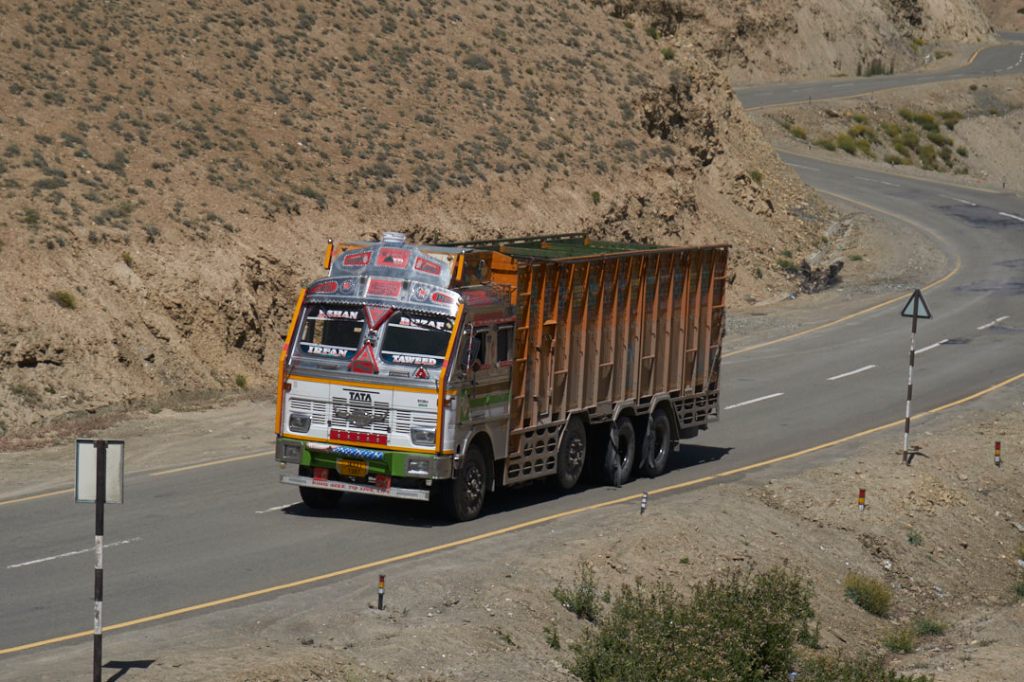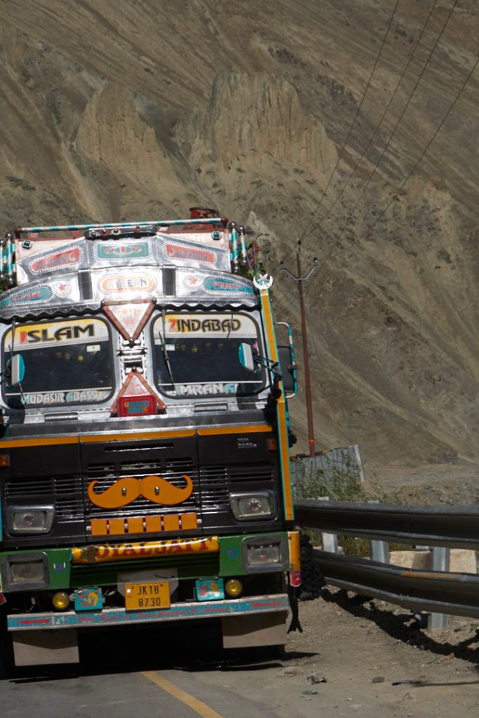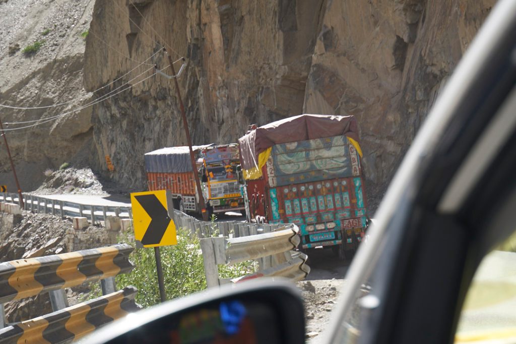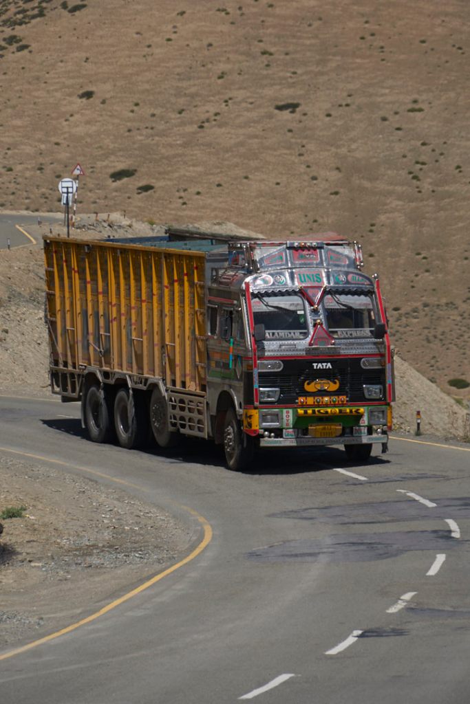 Wir sind heilfroh nicht unmittelbar verwickelt zu sein. Während schon viele Militärs sich um die Unfallstelle kümmern, steuert unser Driver gekonnt vorbei. Die Passstraßen sind sowieso nicht so ganz easy zu befahren. Zum für uns ungewohnten Linksverkehr kommen vor allem unzählige bunte, riesigeTrucks aus Richtung Jammu und Kashmir uns immer wieder entgegen. Sie schnauben und qualmen und die Bremsen quietschen. Aber sie sind wunderschön anzuschauen.