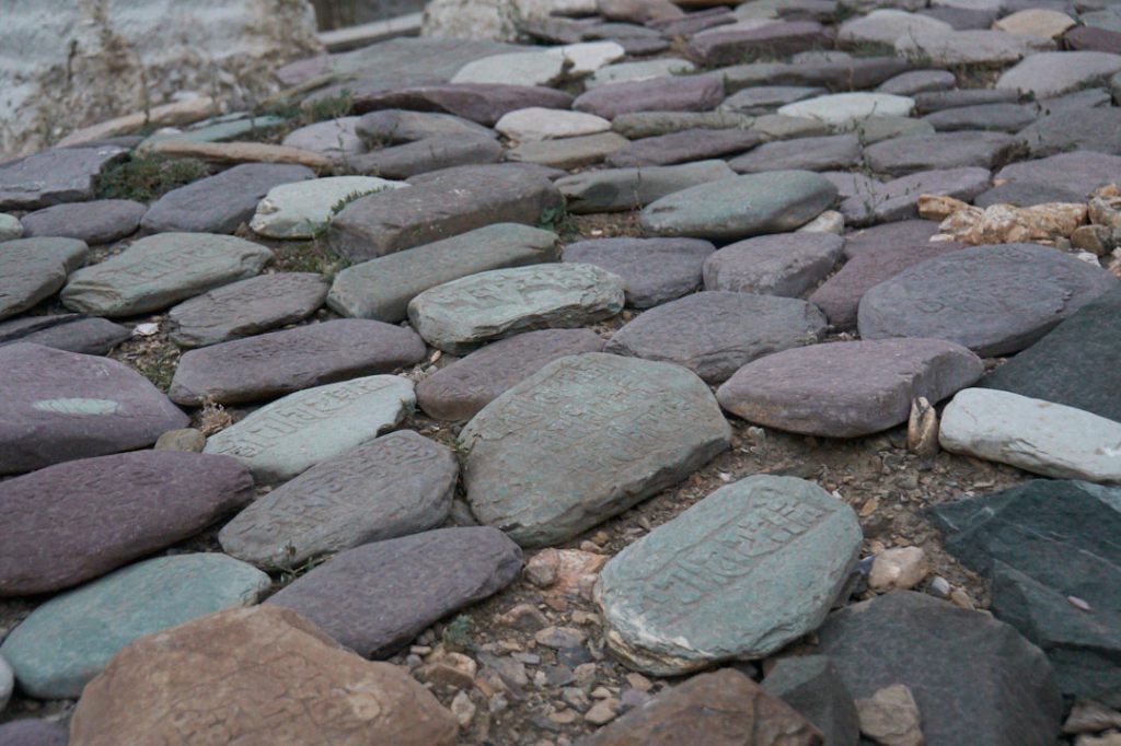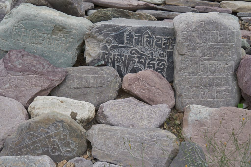 Über den Bergen braut sich ein Gewitter zusammen und auf dem Rückweg zum Hotel sehen wir diese riesige Menge an Mani-Steinen.